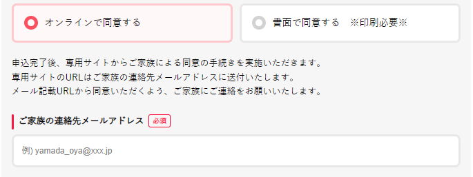 オンラインストアでご家族の同意が必要なお申し込みについて、紙の同意書の印刷・記入が不要で、専用のサイトより簡単にご家族の同意ができる仕組みです。