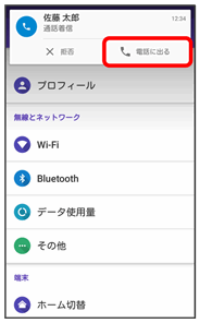 - 着信相手の表示部分をタップすると、着信画面が表示されます。