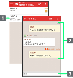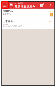 会話型表示では、宛先ごとに送受信したメールをまとめて表示します。たとえば、山本さんとやりとりしたメールを確認するときは、1つのスレッドの中で山本さんと会話をしているように表示されます。
