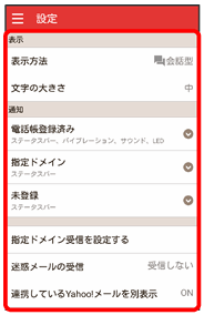 | 連携しているYahoo!メールを別表示 | Y!mobile メールと連携しているYahoo!メールを個別に表示させるかどうかを設定します。 | |