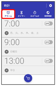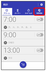 画面を左右にフリックすると、アラーム/タイマー/ストップウォッチ/世界時計の各画面に切り替えられます。
