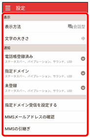 | 電話帳登録済み | 電話帳登録済みの相手からメールを受信したときの通知方法を設定します。 | |