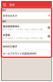 | 受信通知2 | 新着メール受信時の着信音やバイブレーション、着信ランプなどを設定します。 | |