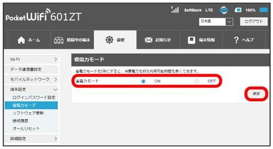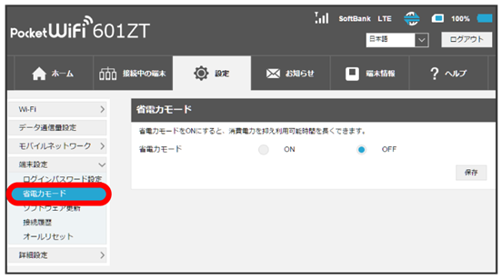省電力モードをONにすることで、動作中の消費電力を抑え、利用可能な時間を長くすることができます。