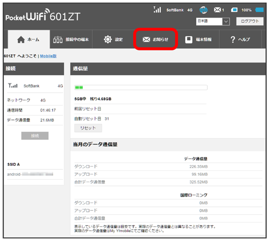 - メインメニューの「お知らせ」タブ