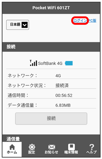 画面右上に「ログアウト」ボタンが表示され、ログインが完了します。メインメニューの項目(設定/お知らせ/端末情報/ヘルプ)をタップしてログインした場合は、それぞれのページが表示されます。