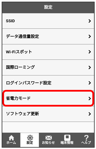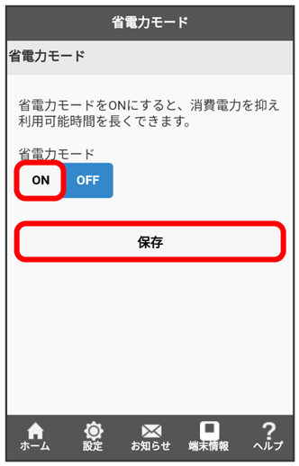 省電力設定をONにすることで、動作中の消費電力を抑え、利用可能な時間を長くすることができます。