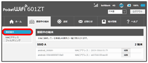 本機に接続している無線LAN端末の一覧が表示されます。マルチSSIDをONにしている場合は、Wi-Fi名(SSID B)に接続している端末も確認できます。
