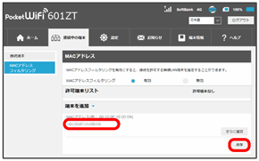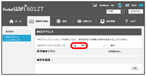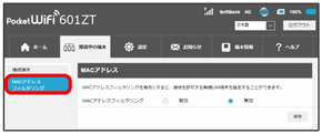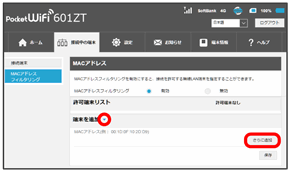 本機に無線LAN接続した端末で、WEB UIのMACアドレスフィルタリングを有効にする場合は、接続している端末のMACアドレスを追加して保存することを忘れないようご注意ください。