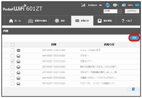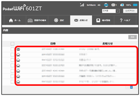 新しいお知らせを受信した場合、本機のホーム画面にが表示されます。WEB UIで操作中はお知らせの受信通知メッセージが表示されます。お知らせは、「お知らせ」タブから確認できます。