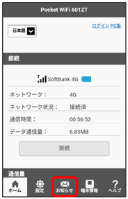 新しいお知らせを受信した場合、本機のホーム画面にが表示されます。モバイル機器のWEB UIで操作中は、「お知らせ」タブからお知らせを確認できます。