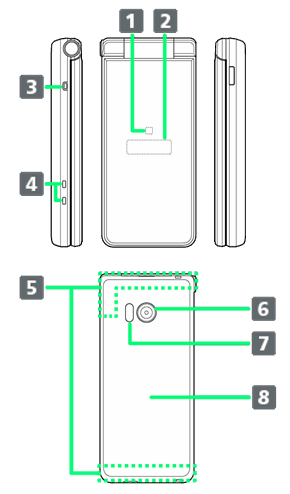 | 通話時、インターネット利用時などに使用します。感度に影響しますので、シールなどを貼ったり手で覆ったりしないでください。 | ||