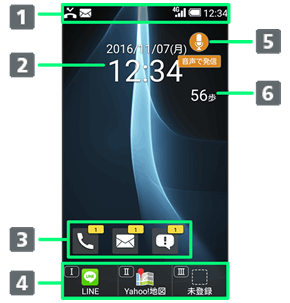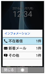 不在着信や新着メールなどがあると、待受画面の下部にインフォメーションが表示されます。