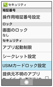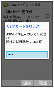 USIMカードロックを設定すると、本機の電源を入れたとき、PINコード(USIMカード用の暗証番号)を入力しないと本機が使用できなくなります。第三者の無断使用を防ぐために有効です。