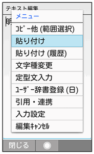 • 貼り付け(履歴)を選んだときは、貼り付ける文字列を選択します。