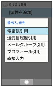 「迷惑メール設定」が無効のときは、以下の動作で振り分け条件が設定され、電話帳に登録していない差出人からのメールが振り分けられるようになります。