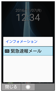 緊急速報メールの受信画面が表示され、緊急地震速報用警告音/災害・避難情報、津波警報用警告音およびバイブレータでお知らせします。