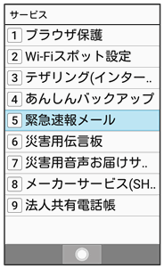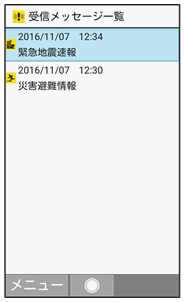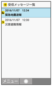 緊急速報メール受信メッセージ一覧画面が表示されます。
