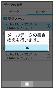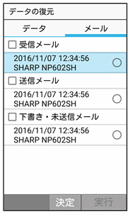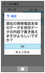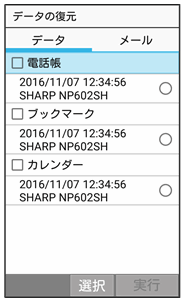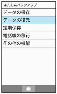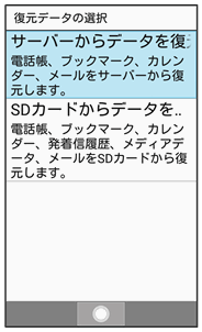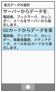 サーバー/SDカードなどに保存した電話帳データ/ブックマークデータ/カレンダーデータ/発着信履歴データ/画像データ/音楽データ/動画データから、データを選択して本体に復元することができます。