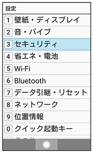 | 画面のロック | 画面ロック解除方法を設定します。 詳しくは、「本機の使用を禁止する(画面のロック)」を参照してください。 |
