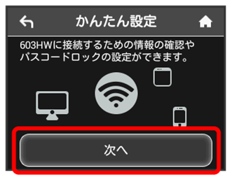 かんたん設定では、本機のWi-Fi名とパスワード(セキュリティーキー)の確認や画面ロック解除時のパスコードの設定について確認することができます。