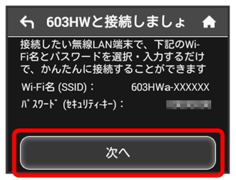 - 画面に表示されているWi-Fi名とパスワード(セキュリティーキー)を無線LAN端末に入力することで、無線LAN端末と接続できます。