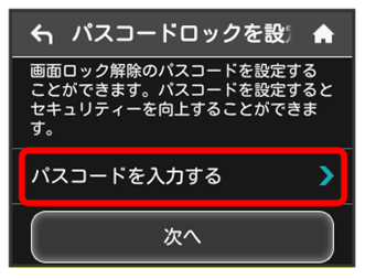 - 画面ロック解除のパスコードを設定する場合は、パスコードを入力する