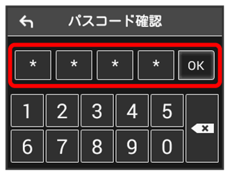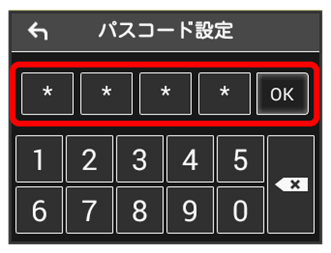 - パスコードを設定すると、画面ロックを解除する際にパスコードの入力画面が表示されます。パスコードを入力して画面ロックを解除する手順については、「パスコードを入力して画面ロックを解除する」を参照してください。