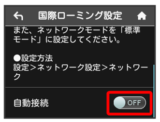 「自動接続」がONになり、海外でローミングが利用できるようになります。