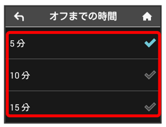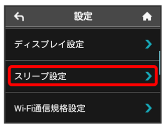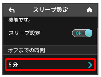 本機が無線LAN端末と接続されていない状態で、本機の操作を一定時間行わなかったときや、本機を充電していないときは、省電力のためにスリープモードになります。スリープモードに移行するまでの時間を設定できます。お買い上げ時は5分に設定されています。また、スリープ設定をOFFに設定し、スリープモードに移行しないようにすることもできます。