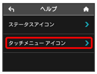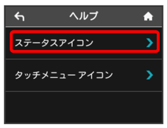 画面上部に表示されるステータスアイコンやホーム画面のタッチメニューアイコンの説明を見ることができます。