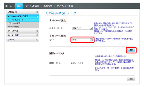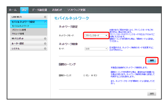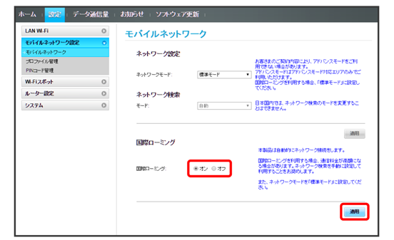 国際ローミングを利用する場合は、ネットワークモードを標準モードに設定してください。ネットワークモードの設定については「ネットワークモードを変更する」を参照してください。