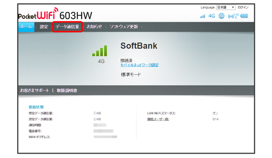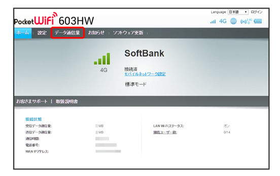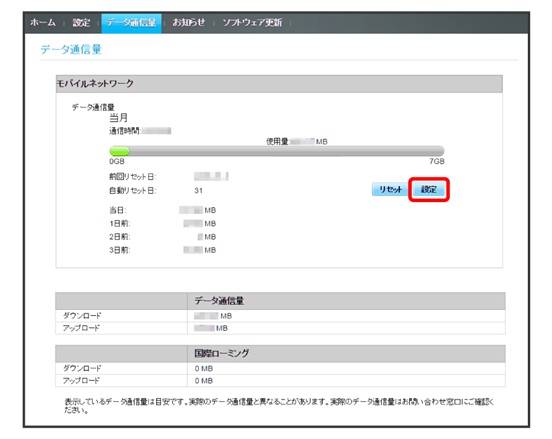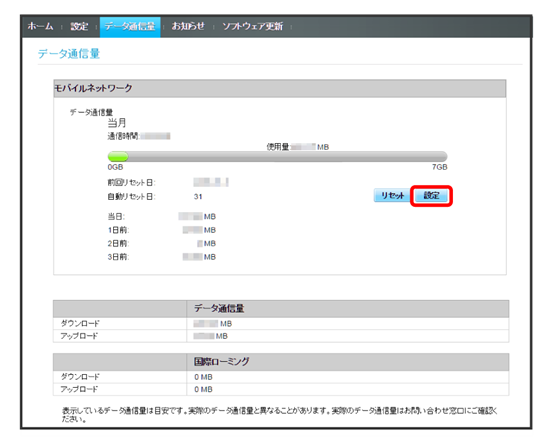 本機のデータ通信量を確認できます。また、データ通信量の最大通信量や、データ通信量のリセット日などを設定します。