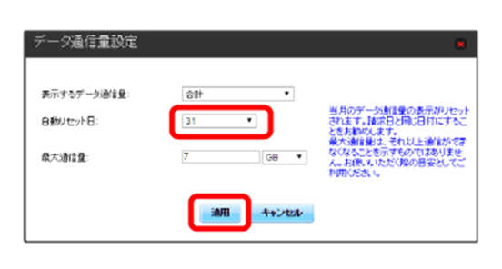 毎月、データ通信量を自動的にリセットする日を設定できます。