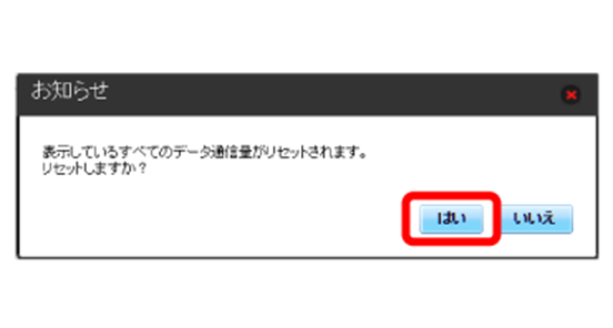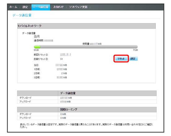 「リセット」は、当月、当日、1日前、2日前、3日前のすべてのデータ通信量を即時にリセットします。