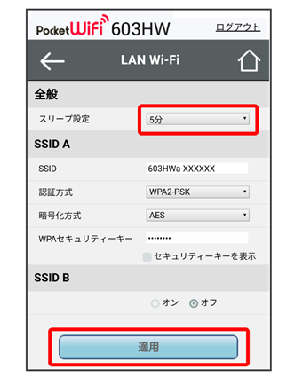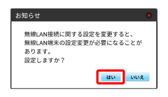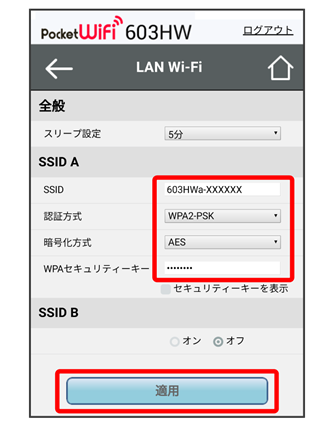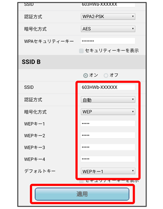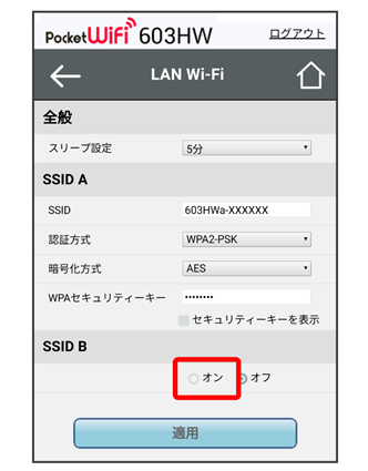 Wi-Fi名(SSID B)のLAN Wi-Fi基本設定が設定されます。