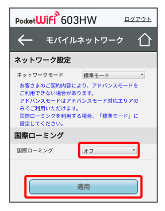 国際ローミングを利用する場合は、ネットワークモードを標準モードに設定してください。ネットワークモードの設定については「ネットワークモードを変更する」を参照してください。