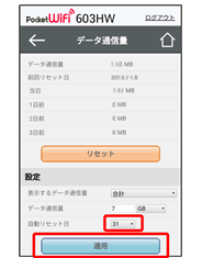 毎月、データ通信量を自動的にリセットする日を設定できます。