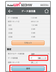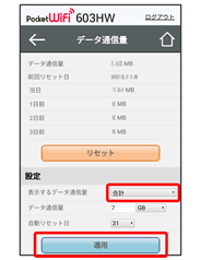 ご利用開始もしくはリセットしてから現在までのデータ通信量が表示されます。また、当日から最大3日前までのデータ通信量も表示されます。