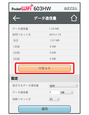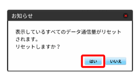 「リセット」は、当月、当日、1日前、2日前、3日前のすべてのデータ通信量を即時にリセットします。
