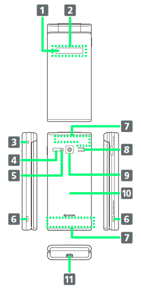 | 通話時、インターネット利用時などに使用します。感度に影響しますので、シールなどを貼ったり手で覆ったりしないでください。 | ||