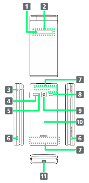 | 通話時、インターネット利用時などに使用します。感度に影響しますので、シールなどを貼ったり手で覆ったりしないでください。 | ||