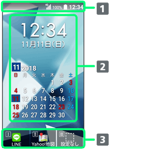待受画面は次のようなしくみになっています。待受画面の設定で、ウィジェットやアプリを貼り付けることもできます。
