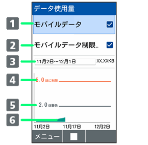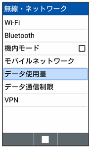 モバイルデータ通信の使用量(1ヶ月単位)を確認したり、使用を制限したりすることができます。