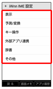 | その他 | ・学習辞書リセット 学習辞書をリセットできます。 ・設定リセット すべての設定を初期化します。 ・iWnn IME iWnn IMEのバージョンを確認できます。 |