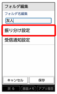 • 受信フォルダ、送信フォルダ、下書き/未送信フォルダには振り分け条件を登録できません。