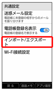 インポート/エクスポート メールデータを本体メモリやSDカードからインポート、エクスポートします。