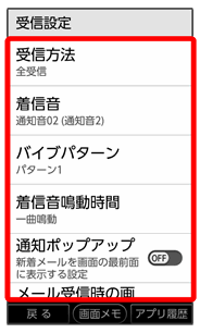 受信設定 メールの受信、通知方法などを設定します。