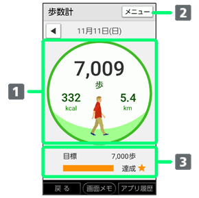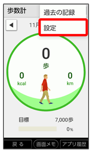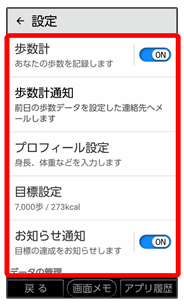 | 目標設定 | 歩数・消費カロリーの目標を設定します。 | |