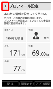 | プロフィール設定 | 身長、体重などを設定します。 | |